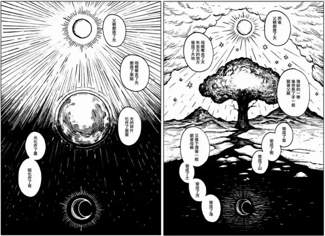世界源自于黑色的父神与白色的母神,而生命源自于二者之间的争斗。