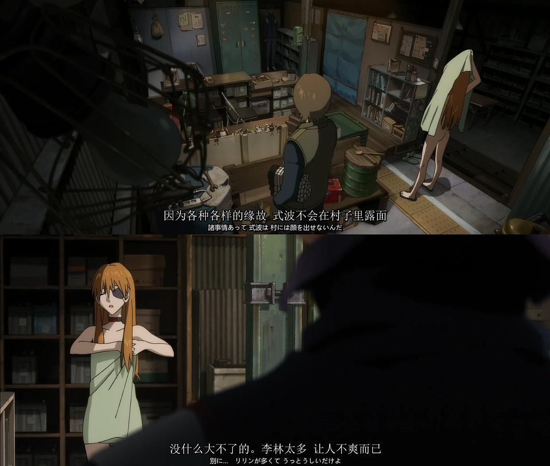 随着插秧育苗,和村里的老婆婆一起洗澡,逗路边的野猫,读儿童读物。以及将战斗服换成了JK服。三号绫波丽的角色的温度也渐渐提升。(这部分日常让我想到了“绫波丽育成计划”)而与之相对的是还未从薰的死之中走出来的真嗣,不吃不喝的他借住在相田和asuka由车站改造的家里。最后忍无可忍的asuka将压缩能力饼干塞进去真嗣的嘴里,这一段的打斗场面丝毫不亚于eva间的战斗。随后真嗣离开了asuka,自己一个人回到了海边。而asuka则偷偷的跟在其后,绫波丽三号在人的社会化过程中渐渐展露出温柔的一面,主动去问asuka真嗣的行踪,并且将上一部从垃圾箱捡来的随身听递给了真嗣,而真嗣则摔了回去,于是绫波又将食物递给真嗣。留下一句,我每天都会来的。