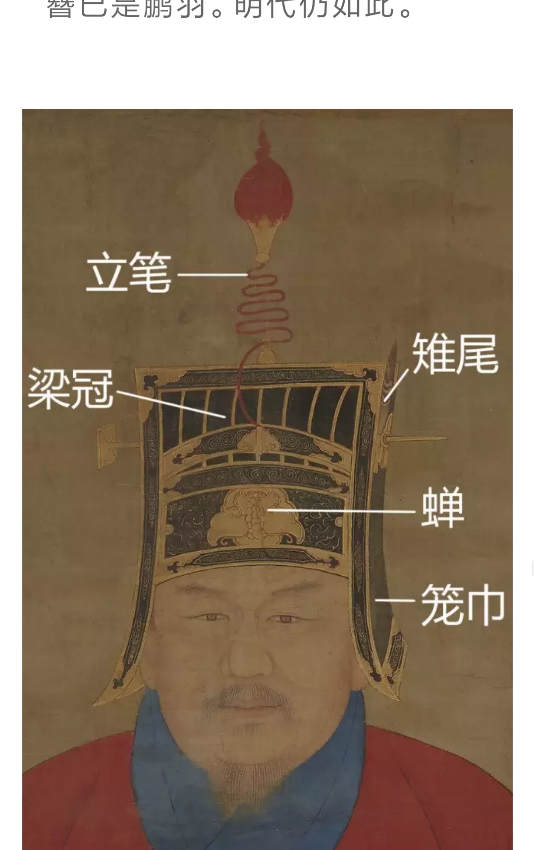 又载“进贤冠以漆布为之,上缕纸为额花,金涂银铜饰,后有纳言。以梁数为差,凡七等,以罗为缨结之:第一等七梁,加貂蝉笼巾、貂鼠尾、立笔;第二等无貂蝉笼巾;第三等六梁,第四等五梁,第五等四梁,第六等三梁,第七等二梁,并如旧制,服同。n貂蝉冠。一名笼巾,织藤漆之,形正方,如平巾帻。饰以银,前有银花,上缀玳瑁蝉,左右为三小蝉,御玉鼻,左插貂尾。三公、亲王侍祠大朝会,则加于进贤冠而服之。n獬豸冠。即于进贤冠其梁上刻木为獬豸角,碧粉涂之,梁数从本品。立笔,古人臣簪笔之遗象。其制削竹为干,裹以绯罗,以黄丝为毫,拓以银缕叶,插于冠后。旧令,文官七品以上服朝服者,簪白笔,武官则否,今文武皆簪焉”