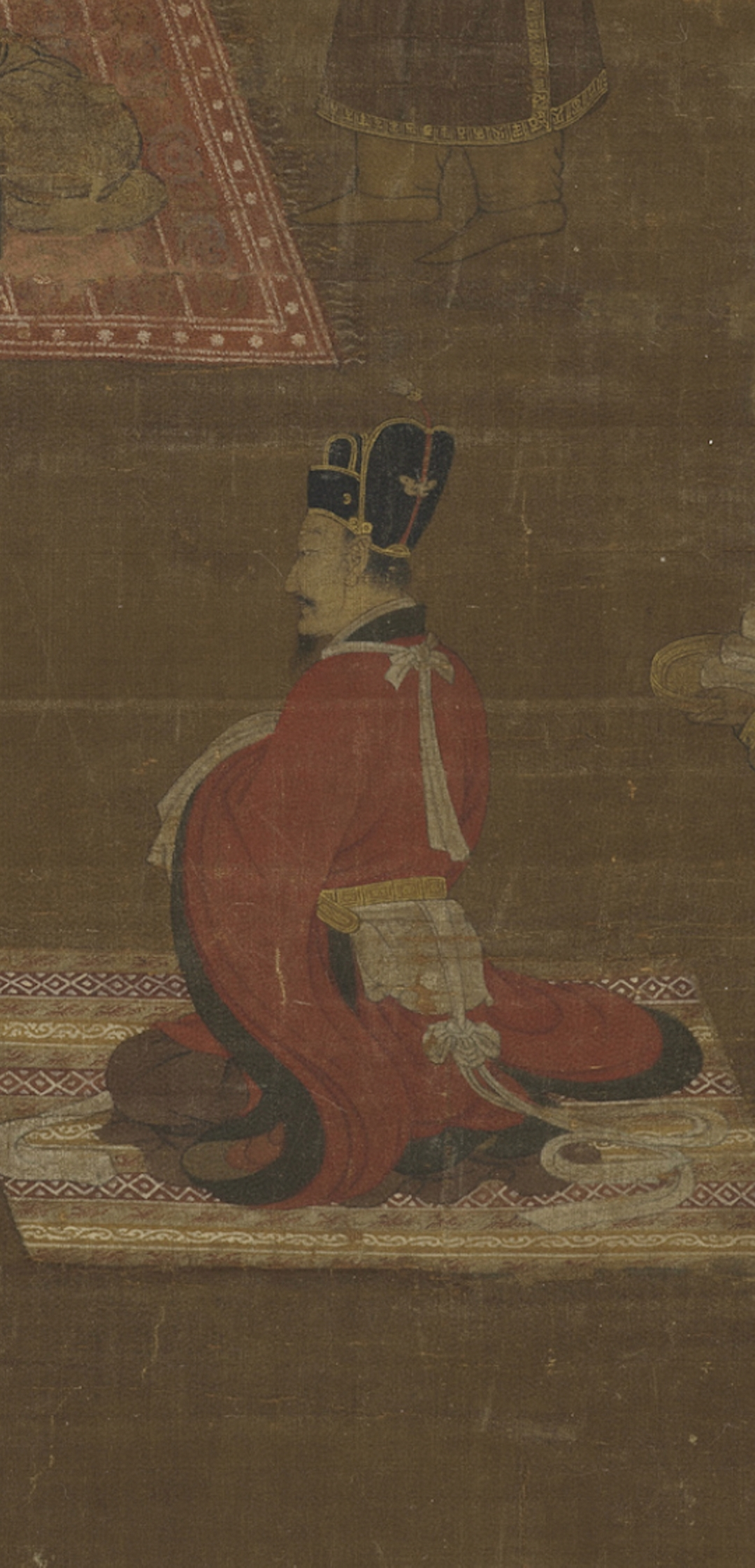 注意:宋代皇帝公服(也叫常服)一共三色六款:柘黄色、赤红色、淡(白)黄色(搭配排方或团方玉銙带);官员公服(大袖圆领襕袍,与帝王常服形制一样)元丰改制以后是这样三个等级色款(七品以上绿色,五品以上绯色,三品以上紫色);宋初到元丰以前,公服一共四色:紫(搭配球路纹金銙带、配金鱼袋)、绯(搭配御仙花金涂银銙排方带、配银鱼袋)、绿(搭配荔枝银銙单铊尾偏带)、青(搭配乌角带);