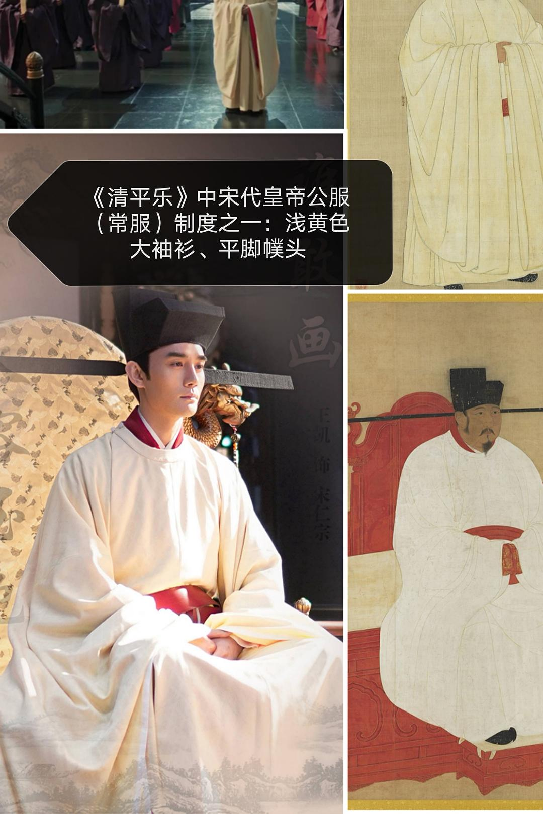 细看该剧服饰的形制与细节,大致可以看到参考宋元人绘图传世的一些形象,如南宋萧照《中兴瑞应图》,马和之《孝经图卷》,《女孝经图》,《人物故事图 》《迎銮图》,《大驾卤薄图卷》,《玉辂卤薄图》,《景德四图》,《文姬归汉图(南宋陈居中绘)》,《中兴四将图》,《歌乐图》,《撵茶图》 《清明上河图》等以及河南巩义宋陵石刻、宁波东钱湖宋代石刻、黄岩赵伯澐南宋墓、白沙宋墓、黄昇墓、蒋师益墓出土服饰资料等历史素材,可略窥此剧服饰还原严谨之一端。 nn观摩《清平乐》剧照及花絮图,服饰与暗纹的图样与历史原型的文物及图像资料接近度很高,剧照中宋代服饰中多用纯色暗纹面料,将宋代人以淡雅低调内秀,这样的高级审美准确还原了出来,细节考究、形制轮廓上较为严谨尊重历史面貌,同时在可以发挥的细节方面,进行适可而止的艺术再创作,又兼顾了荧幕镜头呈现效果,服饰设计上尊古又不泥古。总体上看,该剧对宋代服饰真实面貌的考究贴近程度,在中国影视剧史上可谓是前所未有的第一部,值得为对历史及传统服饰文化爱好者强烈安利。
