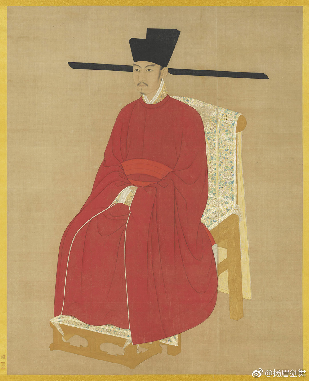 n衣身开衩的圆领大袖袍—袴袍。又有赭黃、淡黃袴袍,紅衫袍,常朝則服之。其制,曲领大袖(圆领大袖,衣身左右开衩),左右开衩,下无横襕(上下通裁),束以革带,幞头(平脚长翅幞头纱帽),乌皮靴(黑色皮靴)。国朝之制,君臣通服平脚幞头,乘舆或服上曲焉(皇帝有时候会戴冲天翘脚幞头)。其初以藤织草巾子为里,纱为表,而涂以漆,后惟以漆为坚,去其藤里,前为一折,平施两脚,以铁为之。