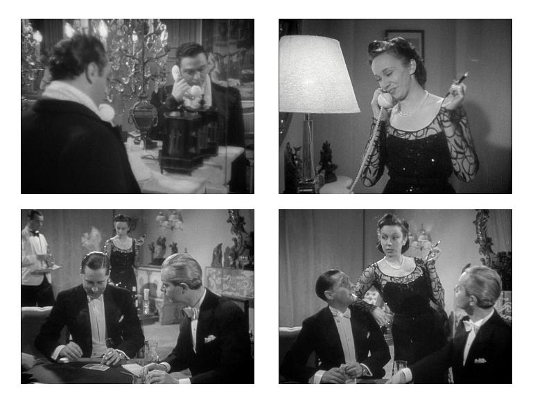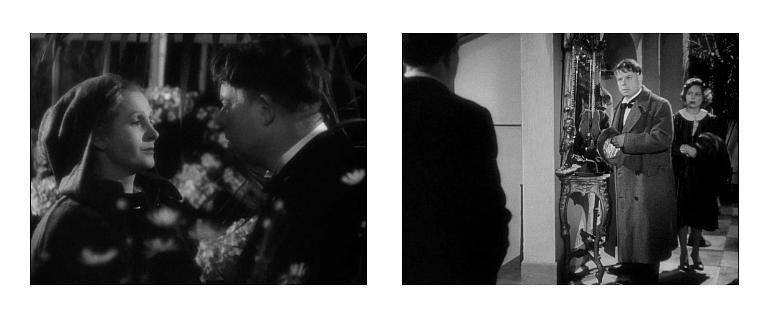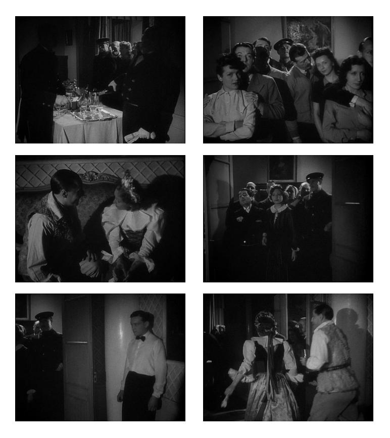 与之相反的是,在雷诺阿的电影中,关系从来不是恒定不变的,而是不断流动,不断生成新的关系。《游戏规则》开场后不久的一个景深镜头对此做出了绝佳的示例:男主人给情人打完电话后(第一段关系),后者走到自家客厅,随着一段优美的横移镜头,前景出现了一个牌桌,两个男人(他们也出现在最后的庄园晚宴中,其中一个还是某个三角关系中的一员)讨论着飞行员与女主人的八卦(第二段关系);旋即,情人上前加入了对话(第三段关系),说出了那句引自尚福尔的重要台词。