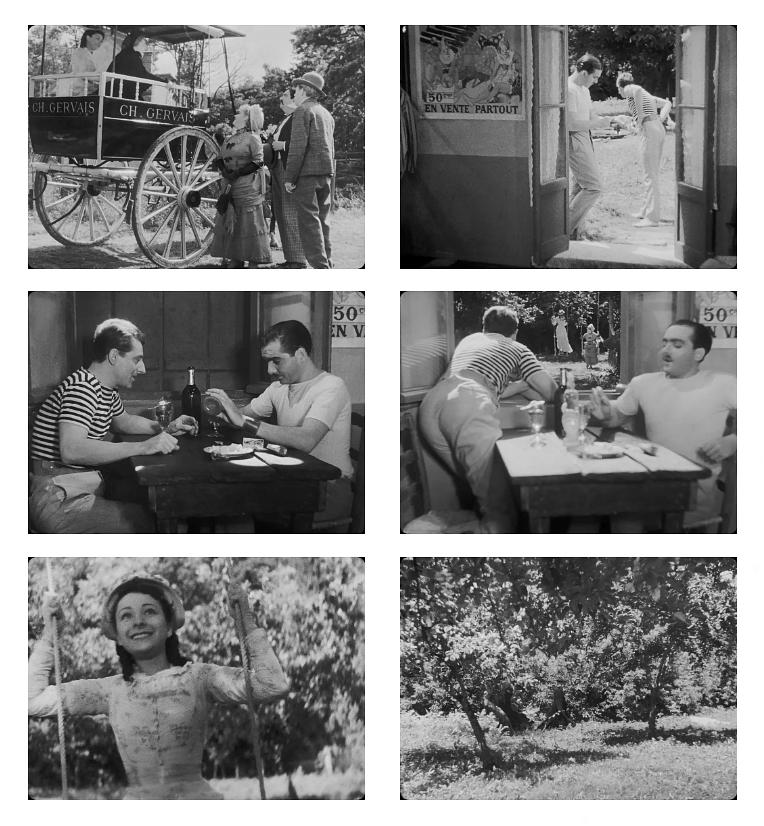 我并不是想重申近半个世纪以来对《游戏规则》场面调度的技术性分析;我想强调的是雷诺阿在调度这一场面时所面临的关键挑战,即,如何用一种整洁的方式去组织这些散落在空间各处的人物?答案在前述镜头中昭然若揭:将复杂的关系网络分解、收束至一段链条,从人物到人物,从关系到关系,摄影机就在这环环相扣的链条之间来回滑动,每一次滑动既让电影移动到下一组关系,又在移动中创造了新的关系。在同时代的电影仍以一个场景、一段戏作为结构细胞时,雷诺阿远见卓识地让关系的传递成为电影行进的基本脉络:《乡间一日》中,巴黎一家乘坐马车到来,引发了两个年轻男人的好奇;他们走进屋里,在窗边坐下闲谈,忽然,其中一人推开窗——巴黎太太和她的女儿正在树下荡秋千。这是整部电影中最美丽的一个镜头,框中框式构图并无紧绷的张力;相反,框内框外轻盈的关系性仿佛一阵微风,从景深处拂面而来。此后,镜头转向屋外,秋千摆荡的方向,一群教士经过,他们驻足凝视,窃窃私语……关系链条再次滑动起来。在雷诺阿这里,场景不是一个个被预设好的、自足自洽的封闭体,而是在关系的传递和层进中被接二连三地打开。