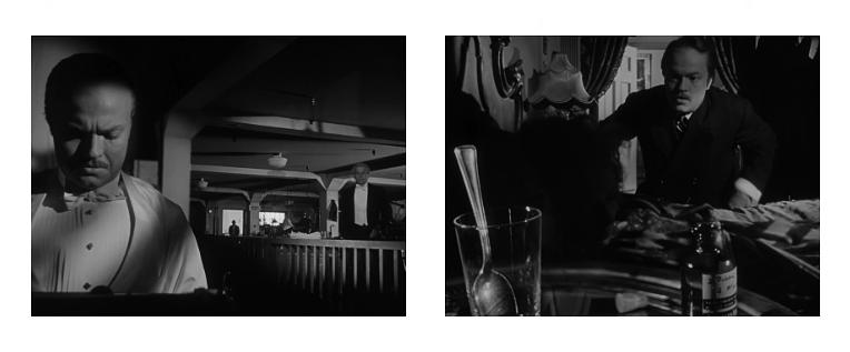 《乡间一日》的这个镜头反映出的另一个问题是:景深镜头前后景之间强烈的差异性,使其成为承载关系的天然介质。但这是一把双刃剑。最坏的例子发生在《公民凯恩》中,其对景深镜头的滥用是如此地懒惰而粗暴,以至于整部电影中几乎只存在一种最为狭隘的关系——对比式的二元关系。镇定剂与病床,打字机与编辑,甚至是奥逊·威尔斯与他自己的镜像,所有这些对象都被景深镜头禁锢在前后景的透视之中,禁锢在单义的、专横的(里维特:“[景深镜头] 畸变的目光强加于主人公一种往往专横的尺寸增减”)、带着表现主义式浮夸的关系之中。