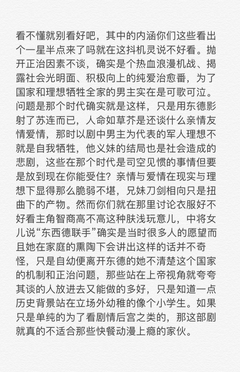 本剧虽然套了一层东德皮,但除了人物有一个德语名字、穿国家人民军制服、互称同志之外,实在没多少“共产趣味”的描写。本来日本动画中外国人说日语是惯例,观众可以脑补这些“德国人”其实在说德语;然而剧中却出现“别在我的名字后面加‘君’字叫我!”“那可以叫你某某‘酱’么?”这种穿帮对白,霎时令人出戏。