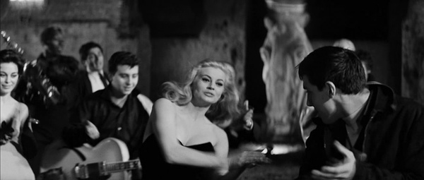 在顶层他俩听着教堂钟声敲响,Marcello说:“这就是神圣的罗马。”Sylvia把他墨镜摘了,自己帽子也被吹走了。进入宴会场景,Marcello跟Sylvia跳舞,对她说:“你使所有事物,所有事物,你是夏娃,母亲,妹妹,情人,朋友,天使,撒旦,地球,家......对了,就是这种感觉,家。.你为何出现在这里?快回美国吧你让我不知所措。”这其实是很奇怪的事情,Marcello是有未婚妻的,但Sylvia带给他家的感觉?Emma是一个极其缺失安全感的人,依赖他,但Sylvia其实对他完全不在意。跳着跳着舞,来了另一位演员,Sylvia就放弃了Marcello,开始了他们的狂欢。
