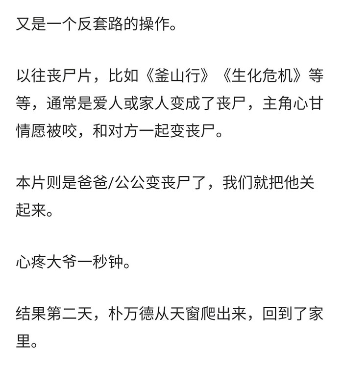 总之,虽然这部丧尸片远没有《釜山行》的血腥与深度,节奏不够刺激,但细想便能发现:密集笑点最终的指向却是荒诞。