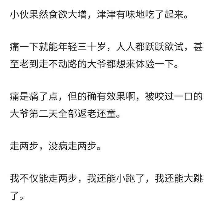 老头们一个个交钱,取号,排队,撸袖子,伸胳膊:吭呲挨一口,隔天变年轻。