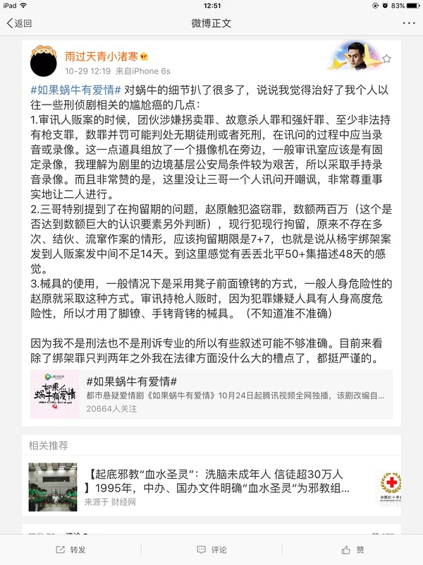 十三、一些观剧问题。nn(1)蜗牛的21集讲的是叶家一个案子,翻来覆去就这几个人,没有周播单元剧的感觉?n还是那句话,可以写论文,题目我都想好了《浅析电视剧周播模式在中国的试水 》,交给2017年毕业的相关专业学生吧,我就不班门弄斧了,只针对前半句说说我的看法。n首先,蜗牛这部电视剧在策划的时候应该就是按 照一个完整的故事来下笔的,即21集中,几个案子串连起来,每集都能前后呼应,这样比较容易设置悬念,到处都是坑,随时都在填,观众在观看的时候能够跟着剧情走,不会中途轻易地放弃。那么在这个基础之上,蜗牛把几个案子都设计跟叶家相关是合理的,正所谓剥茧抽丝,最后的高潮会将前面所有的线索都串起来。n其次,仔细来看看,目前播出的11集中,出现的案子可不是一个,刀片案、张士庸绑架案、 拐卖案、叶梓夕被害案,已经5个吧?好像不是一个哟。nn(2)蜗牛拍得太接地气,跟法制节目似的,没有电视剧 的紧张感悬疑感,看不下去?n我是这么看的。蜗牛这部电视剧的立意在于好好的讲述刑警这个职业的 故事,把大部分的精力放在对工作的展现上,而且力求真实,不玩虚的,还时不时的打一打脸(比如开空调对混淆死亡时间没用,法医测的 是肝温)。n那么这些写实的展现产生了法制节目的感觉,其实应该是剧组所追求的,毕竟能够如此真实是很不容易的,需要前期做很多的准 备工作才能做到让bug的量降到最低,而这种严谨务实的风格,也赢得了全国上下多个警务蓝V的称赞,这是其他电视剧都没有做到的。n至于 影视作品是不是一定要悬疑紧张险象环生才能抓住观众呢?这个就见仁见智了,主要看个人口味。我本人比较偏爱蜗牛这种写实的风格,身边也有一些同好,所以不觉得这是个很大的问题。当然,我个人觉得蜗牛还是具备悬疑紧张的元素的,比如叶梓夕之死,就非常有悬念—— 凶手究竟是谁?她的死亡时间到底是什么时候?她死的那个晚上,到底有多少人来了犯罪现场?这些都挺抓人的。最后答案揭晓的画面还有种诡异的美感,让我觉得观看体验特别棒。豆瓣上有一些朋友在讨论《如果蜗牛有爱情》这个IP拿来拍电影应该挺不错的,脑内想想,叶梓夕这个案子直接拍部电影应该可以有。nn(3)觉得剧情故弄玄虚,很多线索都不讲清楚,观众一个不留神就错过了重要的细节,看得一头雾水,给编剧定义为“讲故事的能力差”?n有些人用“装13界的翘楚《神探夏洛克》”做正面例子,说神夏推理得很快,但是会解释(还配了截图),让观众看得很明白。n关于这种说法,我是这么理解的。n第一,《福尔摩斯探案集》是全球范围的超级大IP,怎么推理都不会脱离小说的框架,所以其实观众在观看电视剧的时候,是有很多的背景知识在支持观看的(也许你没发现,但是这是事实),所以快速推理和其中的关联,一点就透,观众自然容易理解。反观蜗牛,小说情节的普及率自然无法和福尔摩斯比,而且影视化之后,剧情进行了大刀阔斧的改编,即使看过小说,对于理解剧情帮助也不是很大,所以看第一遍的时候有点迷糊太正常了。n第二,作为著名的“三集片”,《神探夏洛克》的结构非常紧凑,基本上一集一个案子,同一个案子的信息会在短时间内密集的出现,此时观众的记忆力还都是新鲜的,自然觉得清楚明白。而蜗牛作为21集的电视剧,肯定是到处挖坑的,如果你没有100%的集中精力去观看,甚至是反复观看,肯定会漏掉关键信息的。n第三,蜗牛的线索多且细,是适应周播的节奏的。每每在关键的地方卡住,留一堆坑让观众自己先去试着填一填,不是很好玩么?比如第九集结束叶俏承认是自己杀害的叶梓夕,但是多人觉得不对劲,兵分几路去重新寻找真凶,从而引发了观众的大量讨论,这不就是要达到的效果么?看一次就能得出答案,和反复推敲热烈讨论之后才得出结论,哪个过程更好玩呢?反正我选后者。nn十四、第十二集浅析。nn(1)台词里说了几个单位,开会就真的来穿军装的了。