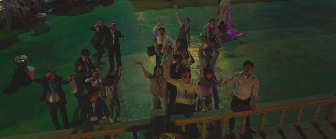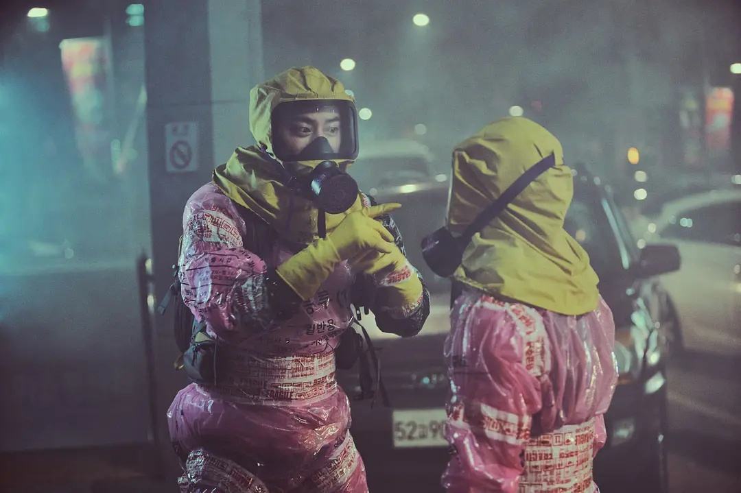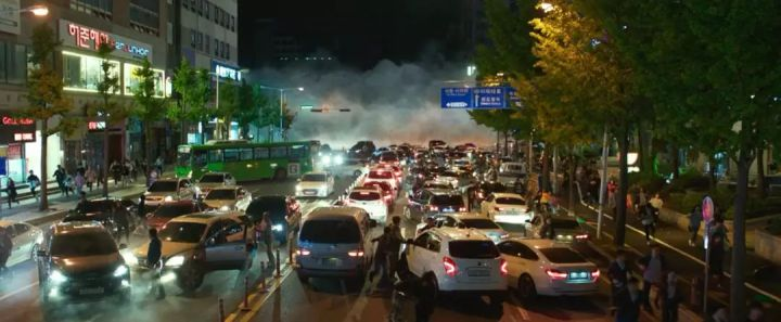 与此同时,也可见本片诚挚积极地以丰富细致的细节与新世代对话,创造话语连结。如导入当下蔚为风潮的直播文化,以全民关注的形式,创造宛如闯关游戏的既视感,一方面侧写猎奇的媒体心态,另方面也有效推进故事,甚至营造出多线叙事的紧凑感。又如加入聚餐热点烤肉店的情境,巧用典型烤肉店的排烟管,制造新一波的毒气危机。诸如此类的细腻设置,都精巧融入关键情节中,并一次次将本片推至高潮。当一台台空拍机如亮起的星辰群聚在夜空中,照亮无助的两位主人公时,那心中涌起的澎湃,一点都不逊于《复仇者联盟4:终局之战》中众英雄的集结时刻。乍看两位主人公不过是灾难中的两个渺小个体,实际上他们背后所折射的,却是整个韩国社会渴求生存出口的焦虑群像。