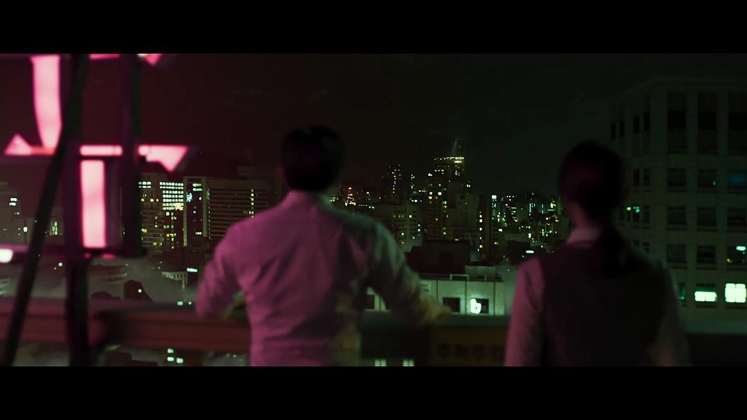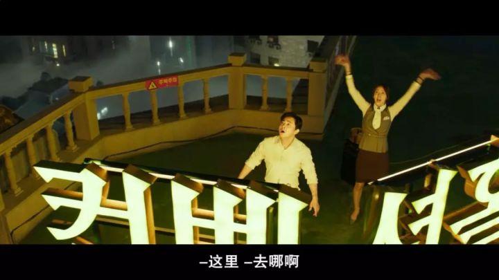 这里在天台发现原来有梯子的情节,轻松幽默地调试了观众紧张的心情,但其实两人刚进入这个天台,导演就已经通过墙上的文字埋下了这里有梯子的伏笔。