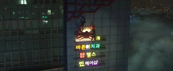 这里的镜头调度很赞,镜头面向男主往下摇,来到了健身房对侧楼下的烤肉店。