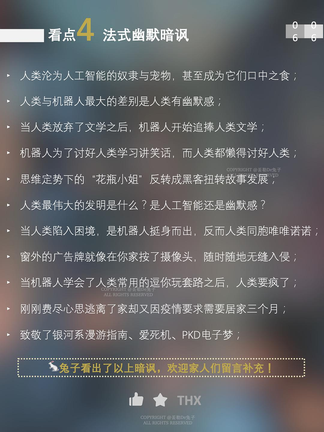 ????茶余饭后很希望这部片子能让你捧腹一乐,也希望这部片子能让你开始幻想未来的同时反思人类曾走过的路。人与人工智能的关系已经是个非常老套的主题,但热内的探讨不输给pkd,这种充盈着浪漫炫彩的希望感只有热内能够表现出来,所以不要错过这里面每一个可爱的人和机器人,哪怕是这里面的反派尤尼克斯都是一个很可爱很富人性的机器人。同期对比今年卡司阵容强大的#不要抬头,巨型漏洞才是挺直腰板敢挂科幻&暗讽标签的优质电影。
