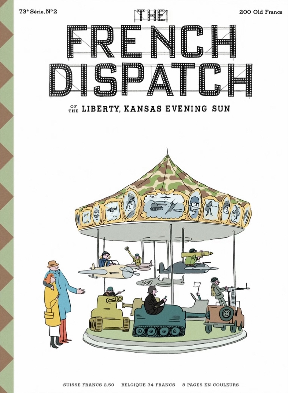 《法兰西特派》是韦斯·安德森笔下围绕著名英语周刊《纽约客》的历史而打造的虚构刊物,也是其今年上映的新片的名称;它也是一群其笔下的虚构记者(同样,原型也是《纽约客》的多位撰稿人)共处一室写作、讨论与出版作品的“家”,在这里,他们能够以“我们”的名义写作;在这座被安德森戏称为“Ennui”的城市中,这是一群外来人士,默默地或者惊天动地地观察着其中发生的事件;当然,以上这些都未曾存在过,它最终仅仅是一位作者对其它作者的想象——巴黎太大了,他不得不将其缩小成属于自己的口袋书版本,诚然其依旧有着四通发达的道路和琳琅满目的街道社群,但看着还是就如一座玩具屋一般,或者一只可颂面包,那一层层由面团与黄油不断折叠混合并加以烤制的酥皮内部好像包裹着什么——关于这部电影,或者他们说的,这些“东西”,这些“层”,这些漫画书般的运动和人物,这些琳琅满目的装饰,引发了一定程度的误解;我们也未必真的需要为韦斯·安德森辩护,因为在该片中,安德森的机制发挥到了极致,也就意味着它看上去仅仅可能是某种似乎只有简单表面的形象:镜头设计、对称、平移轨道、戏剧、明星阵容、法国、巴黎、《纽约客》、“五月风暴”、詹姆斯·鲍德温、故事集、阅读、现代艺术、后现代艺术、中产阶级、虚无、童话、复古、致敬、美食、“春节联欢晚会”(???)等等,还有很多东西,但这只是第一层。