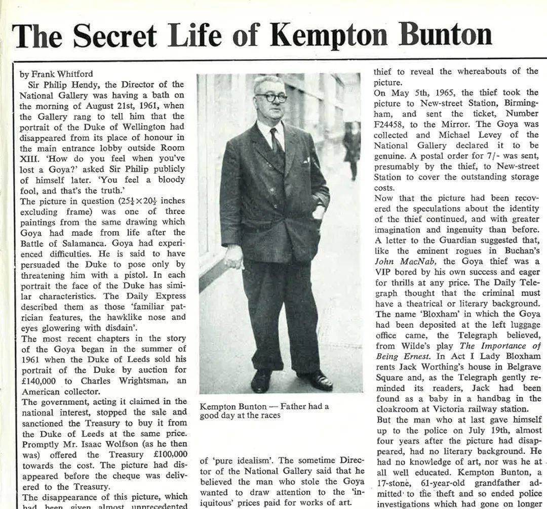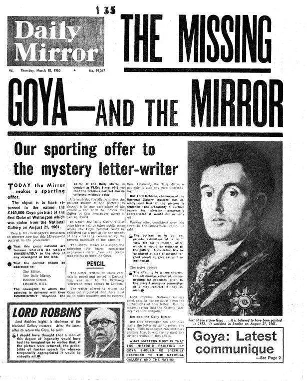 1961年,弗朗西斯科·戈雅(Francisco Goya)的《惠灵顿公爵肖像》(Portrait of the Duke of Wellington)画作被一位美国大亨在拍卖会上从一位英国贵族手中购得。随后,英国政府介入购买该画作,并将其留在英国,它于那年 8月2日在英国国家美术馆展出。8月21日,作品被盗,直到四年后才再次出现。