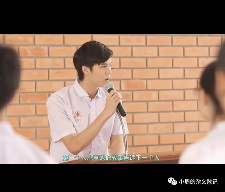 Win的第二次高光时刻是他在全校集会中借一则故事安慰并支持低谷中的Kwan.学校里,Kwan因为是情妇的女儿被同学们议论纷纷,指指点点. Win暗暗着急,所以在一次集会中,他用传声筒游戏作比,提醒大家一个人听到的事可能和事实失之千里,而我们根据失真的故事对一个人做出的判断可能是完全错误的.这真的是一次高水准的安慰,不仅传情更传理,给人带去温暖,更启发人思考.从侧面也揭示了他自己看待人和事物的准则.
