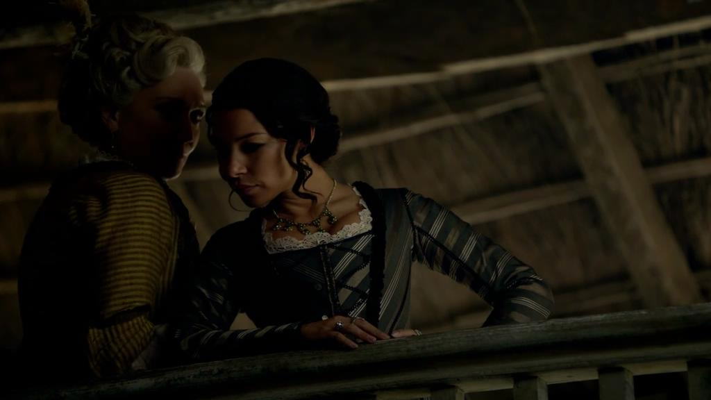 还有一点有趣的就是涉及到性爱和权力关系,Eleanor内心母系和父权体系的矛盾转化,和她最终屈服于现实强权的隐喻都可以通过这一场场不同姿势体态的性事表现出来。第一场,Eleanor失意地摊坐在Max的床上,此时脆弱的Eleanor表现得温顺可人内心是母系倭黑猩猩,Max开始主动抚慰她。第二场,Vane在和Flint的谈判中主动让步,使偷袭西班牙宝藏船的计划顺利进行,此时三个人处于平等合作关系,Eleanor主动来Vane的帐篷投怀送抱,一开始是非常侵略性地top互解衣带,然后变为bottem。第三场,Vane为了保护Eleanor替她除掉了危险份子,Eleanor臣服于男性强势力量,并且主动让Vane后入,这场性爱的支配权是Eleanor主动交给Vane。第四场,在知道自己即将面临的危机后主动向Rogers表明爱意,这场支配权完全在Rogers了,有一个意味深长的远焦镜头,就是Rogers视角下全裸的Eleanor,此时的Eleanor已经完全成为了一个父权审美下的“女人”。此时的Eleanor已经完全臣服于父系强权了。第四季的悲剧走向似乎已经既定,她一生都在与自己的命运作斗争,但依旧只能屈服于现实,她无法把自己从过去的枷锁中解放出来,无法像Vane一样洒脱,她永远活在体系桎梏之下,最终成为现实的牺牲品。