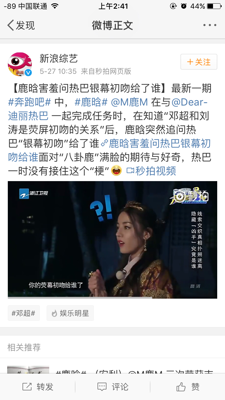 与节目质量相对应的是,粉丝在微博上的战斗力真的越来越强了,今天一登豆瓣,发现l粉都评论我这里了,那就不难解释我前两天微博发了一个好喜欢迪丽热巴和鹿晗的cp 带了话题然后被粉丝各种"评论"交流"