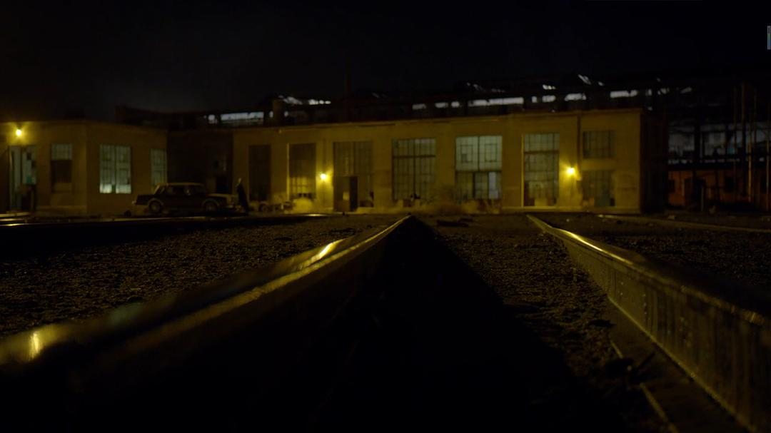 麦克与黑市商人交易现场,用大光圈,焦点锁在铁轨上,而虚化背后的麦克,其实反而突出了主体nn