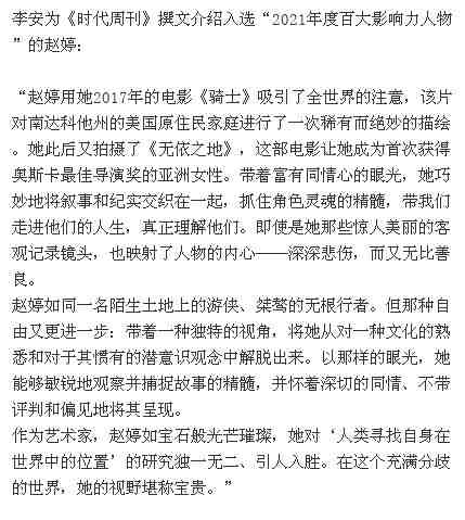 最后一个问题留给大家,这里放一段李安为赵婷撰写的介绍。