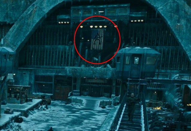 *注:在本片中,“The only good ape is a dead ape.”是上校领导的军队的一支口号,这实际上和老版系列第二部《失陷猩球》中的“The only good human is a dead human.”形成对照。而在《失陷猩球》中,这句话出自一位猩猩将军之口,他在公元3955年鼓动猿族杀光残余的人类。