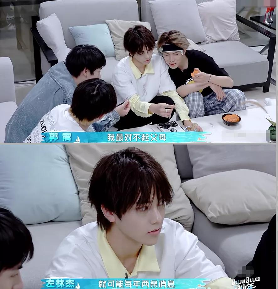 左林杰回忆自己几年前离家去异国当练习生时,一心想自由飞翔,不理解父母问长问短的啰嗦背后的牵挂,很少回应,现在想起来很是自责愧疚。郑人予也后悔曾冲动出走让父母担心。