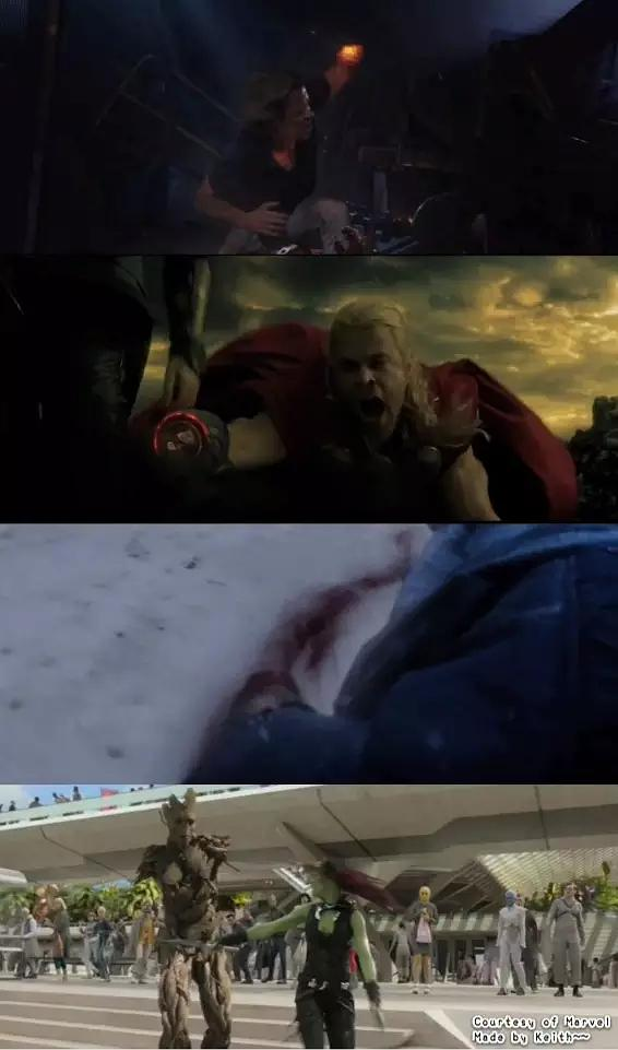 n断手梗n漫威第二阶段的每部影片都有断手梗,这是向《星球大战》中天行者·卢克的断手情节致敬。n《钢铁侠3》:基里安博士Aldrich Killian因攻击钢铁侠而被砍手。n《雷神2:黑暗世界》:雷神索尔在幻象中被弟弟洛基背叛而惨遭断手。n《美国队长2:冬日战士》:巴基因为掉落山谷而断臂,后来被装上了机械手臂。n《银河护卫队》:树人格鲁特在卡魔拉的打斗中被切断双臂,不过很快又重生了。n《复仇者联盟2:奥创纪元》:一处为Ulysses Klaw被奥创砍手,另一处为反浩克装甲Veronica在打浩克时断了一只手臂。