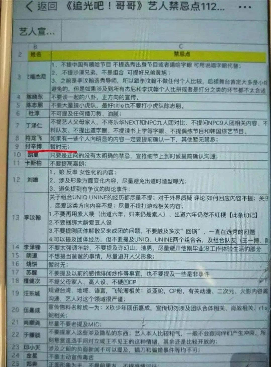 节目播出后,一张《追光吧!哥哥》艺人禁忌表开始在网络上流传,完美诠释了什么叫“咖不大事儿挺多”。 既想要热度又想让黑历史在观众面前消失,想得都挺美哈。