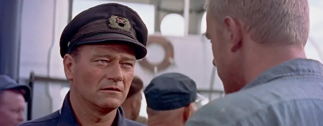 又名海上追逐战,约翰·韦恩主演。这次他扮演一个德国货船的船长。二次大战前夕,西方限定希特勒的纳粹德国撤出占领的波兰领土最后通牒的那一天,在澳大利亚的悉尼,停靠着一艘古老的德国货船“艾根号”,船长卡尔·欧利希曾经是德国海军重巡洋舰冯·莫尔克号的舰长,至于为何来到这艘破旧的商船当船长,卡尔讳莫如深,绝口不提。
