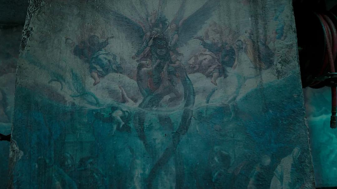 影片中不少个镜头充满了克苏鲁的味道,比如废弃站点衣柜里匪夷所思的地图和上面的涂鸦,带有传说味道的壁画,以及最后现身的巨大满是触手的怪兽,看过洛夫克拉夫特小说的人都知道,这不就是沉睡在拉莱耶的克苏鲁么!这个克苏鲁的造型和风格(满身小克苏鲁)非常有味道,非常克苏鲁风,狂乱和恐惧的集合体!