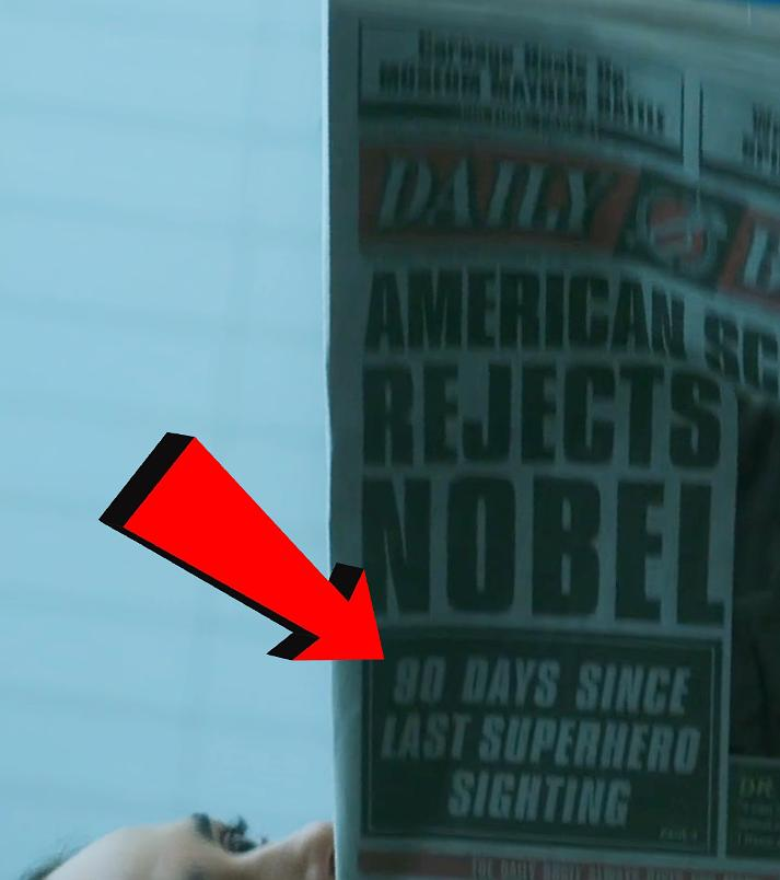 片尾第一个彩蛋是紧接着《英雄无归》的结局来的,还是那道紫色的天之痕,秃鹫发现他被传送到了陌生的平行宇宙。由于这个宇宙没有他的犯罪记录,所以他被无罪释放了。预告片里他和莫比亚斯在这里打了照面,公映版本里则没有。