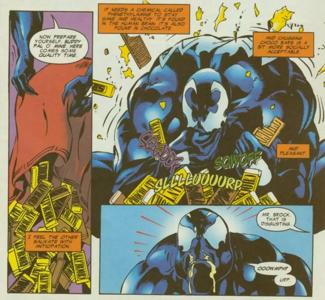 这是因为共生体的主要食物来源是苯乙胺,这种物质通常存在于人类的大脑或巧克力中,所以在没有巧克力的情况下,共生体会要求宿主吃掉敌人大脑,这种行为是毒液或其他共生体角色最常用的攻击手段之一。