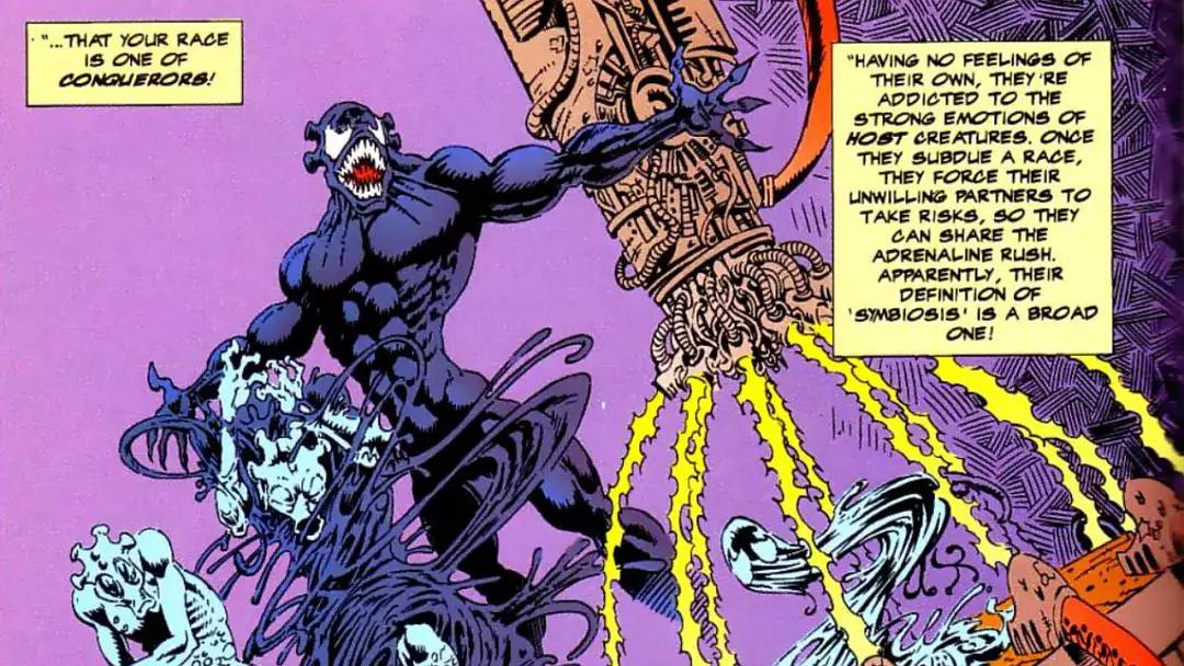 影片中暴乱提到毒液是共生体军团中最弱的一员,在漫画“共生体星球”(Planet of the Symbiotes)故事线中也有类似的设定,里面提到共生体会不断榨干宿主的能量,让自己变得更加强大,而毒液却追求与宿主和谐共融,因此被同族视为异类,并被关进了监狱。