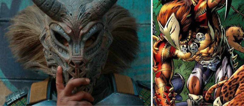 温斯顿·杜克饰演猿族统领姆巴库(M'Baku),漫画里这个角色有个绰号叫人猿(Man-Ape),初次登场于漫威《复仇者联盟》#62 (1969),是瓦坎达第二强大的战士,白猿氏族首领,也是黑豹最强大的反派之一。考虑到种族主义问题,电影并没有让姆巴库像漫画里一样身披猿皮,而是在服饰上加入了白色毛发这样的小细节,还有出场时头戴猿猴面具,也是对漫画造型的还原。