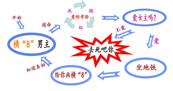 3 进入特定时空类:如《死亡幻觉》,《罗拉快跑》,《恐怖游轮》,此类循环是进入一个特定的时空从而循环,就像进入了一个黑匣子,此类的特点是进入黑匣子前,时间线是正常,跳出黑匣子后也恢复正常。恐怖游轮更高明,黑匣子的出口连到入口,大循环套小循环但前提是女主被抹去了记忆(这本来就是死神的惩罚)。此片最像此类,所以很多评论都说是恐怖游轮的高仿,仿是仿了,可一点都不高!在此片我找不到进入黑匣子的点,如果说开始遇乞丐是入口,那么进入循环前男主手上的8谁画的,影片最后女主画了8,但男主对它无毫无印象。如果结尾是大循环的开始,那么,男主 在循环中应该有上一个大循环全部记忆,影片没有任何交待男主被抹去记忆。