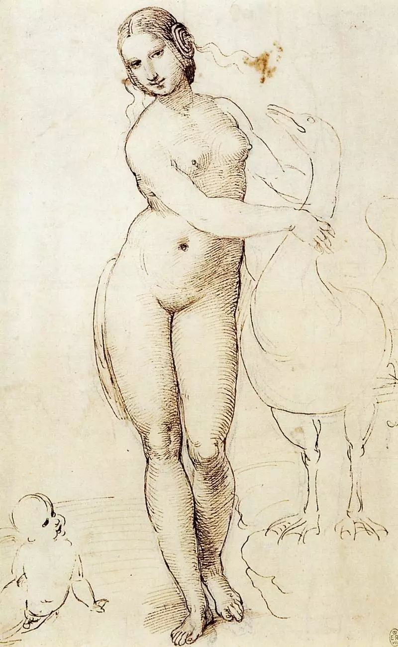 《丽达与天鹅》源于希腊神话,相传丽达是克里特王国的公主,嫁给了被驱逐流放于此的斯巴达国王延达瑞俄斯。婚后,她的夫君重返斯巴达,又成为了国王,而她只能独居于一个无人的小岛上。主神宙斯化形为天鹅,同斯巴达王廷达瑞俄斯之妻丽达结合,丽达产蛋,生下了绝世美女海伦和另一女儿克吕泰涅斯特拉。