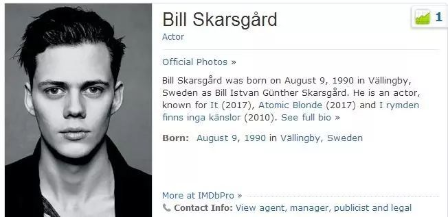 2017年版的小丑扮演者比尔·斯卡斯加德现在也是27岁。