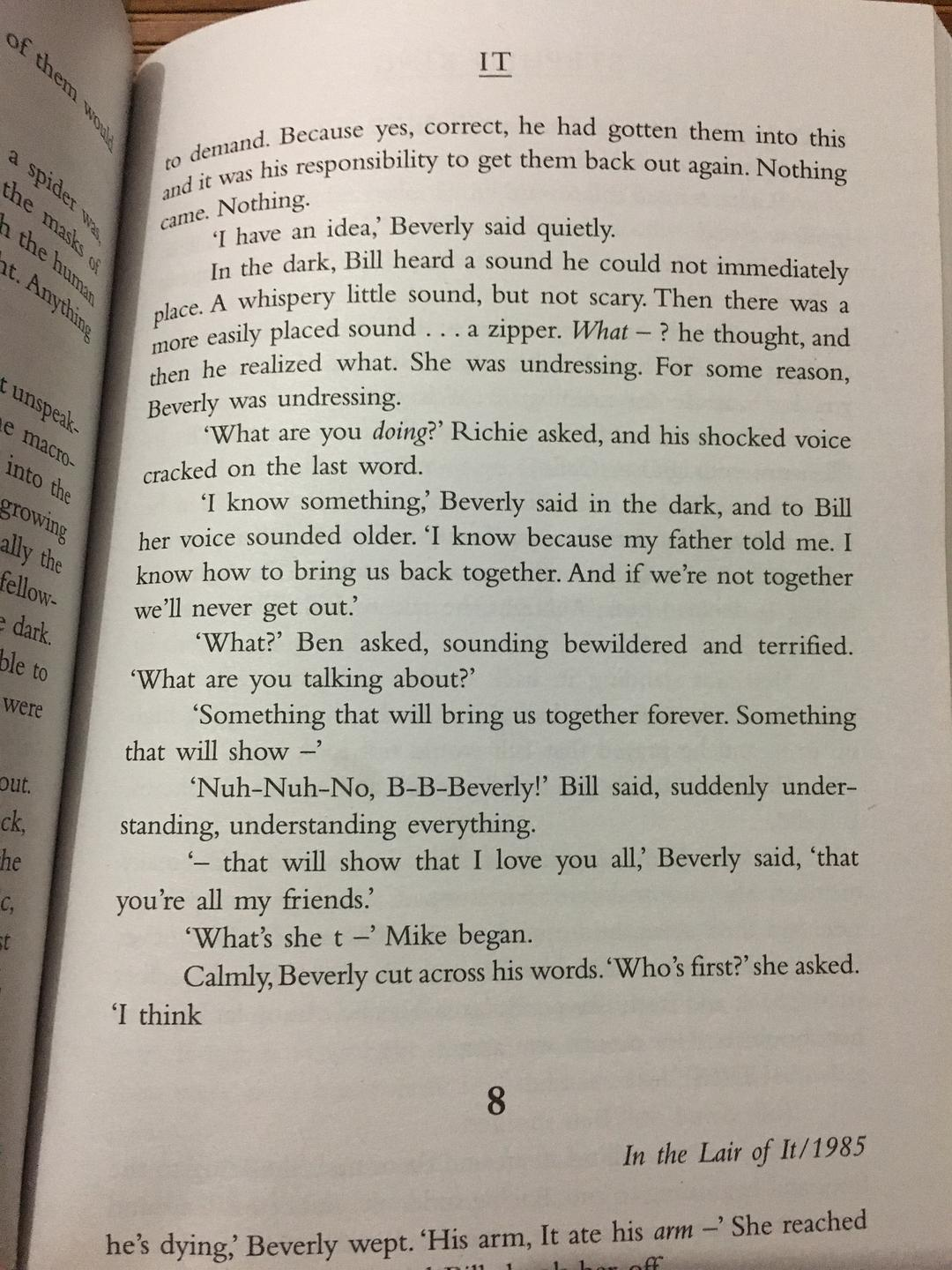 在黑暗中,bill听见了一种无法被快速分辨的声音,细小宛如轻语的声响,但并不怖人。紧接着,是一种....拉链的声音,什么?他想着,然后他意识到了,她正在褪去自己的衣服,不知为什么,beverly正在脱衣服。