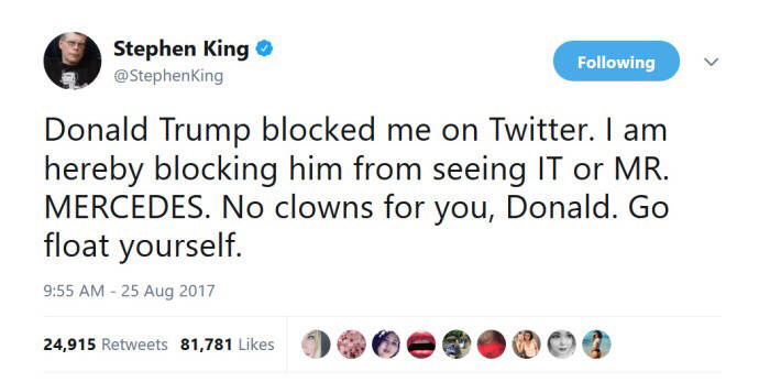 “告诉你的朋友,我是某个灭绝物种的最后幸存者,”它一边说着,一边摇摇晃晃跟着她走下门廊,露出瘦削的狞笑,“是垂死星球上的唯一生还者。我来是为了抢走所有女人……强暴所有男人……”——《小丑回魂》穆卓芸译本