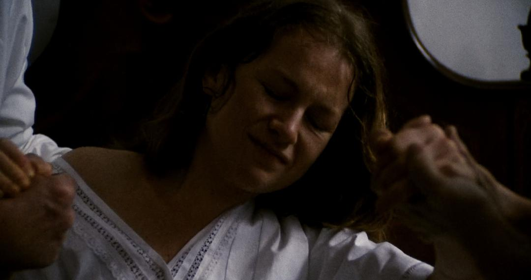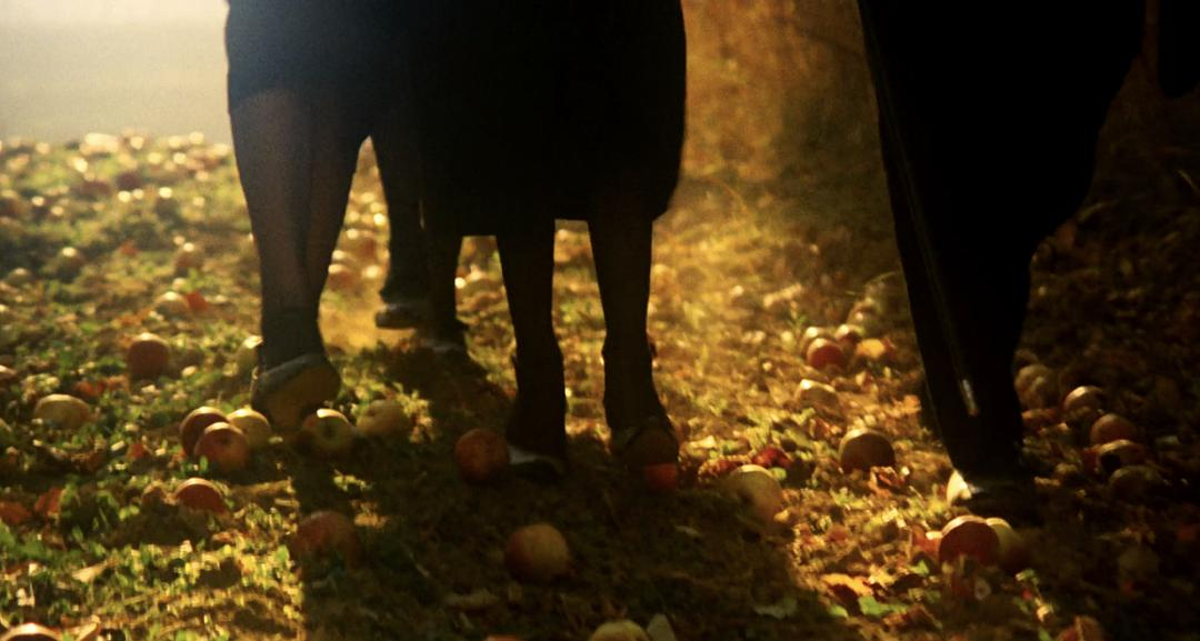 There is also a brief sequence in which Szilvia disguises as a man and tries to convince Irène to be her surrogate mother. Both Freud and Irrigaray have pointed out that the woman seems to be more bisexual than the man. Szilvia's intimacy with Irène and her eventual success in "buying" her echoes this theory and affirms her performance of masculinity. Szilvia's suggested bisexuality also posits her as an epitome of the woman who oscillates between lack and excess in psychoanylysis, yet she cannot be defined and abstracted into the Woman with a capital "W" because she is simultaneously hypersexual and sterile. Montrelay claims that in order to be symbolized it is necessary that the woman put herself at stake, for the female body "is an object in excess which must be 'lost'", and the maternal body offers exactly that desired loss. But the impossibility of becoming pregnant for Szilvia means that she has nothing to lose, nothing to deter her from emotional outbursts. She follows Akos and Irène persistently, cries whilst smiling, and appears to be masturbating naked lying by Irène's door. While the speculation that hysteria is a malaise of the womb is absurd, in the case of The Heiresses it offers an uncanny explanation to Szilvia's profound sadness. Szilvia's syptoms also parallels that of Justine in Lars Von Trier's Melancholia. Justine's melancholia is temporarily relieved as she bathes nude in the chilling starlight, then the camera shifts to a close-up of the star that shares the same name with Justine's malady, foreshadowing the total destruction Melancholia would later bring. The same collision of eros and thanatos is present in The Heiresses. The confirmation of Irène's pregnancy coincides cruelly with the death of Szilvia's father. He is buried in an apple orchard where afterwards Szilvia and Akos make love in a room full of apples, the very symbol of sin and desire.