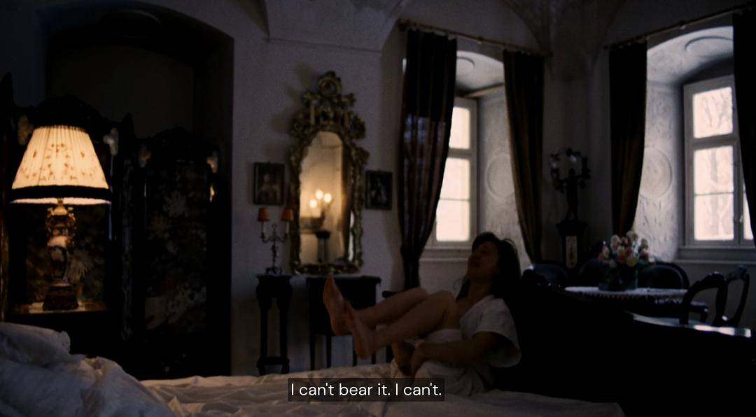 Another example of distruptive noise occurs when Irène is giving birth, as Szilvia impatients awaits in another room, dressed in the same white gown, she repreatedly mumbles in pain: "I can't bear it," echoing what Irène said earlier when faced with the impending reality that she must give away her child. Szilvia's cries gradually fuses with the newborn's, signifying a return to pre-Oedipal sexuality which escapes the grasps of the symbolic. And last but not least, the leitmotif of the song "Don't Ever Say" plays an important emotive role throughout the film.