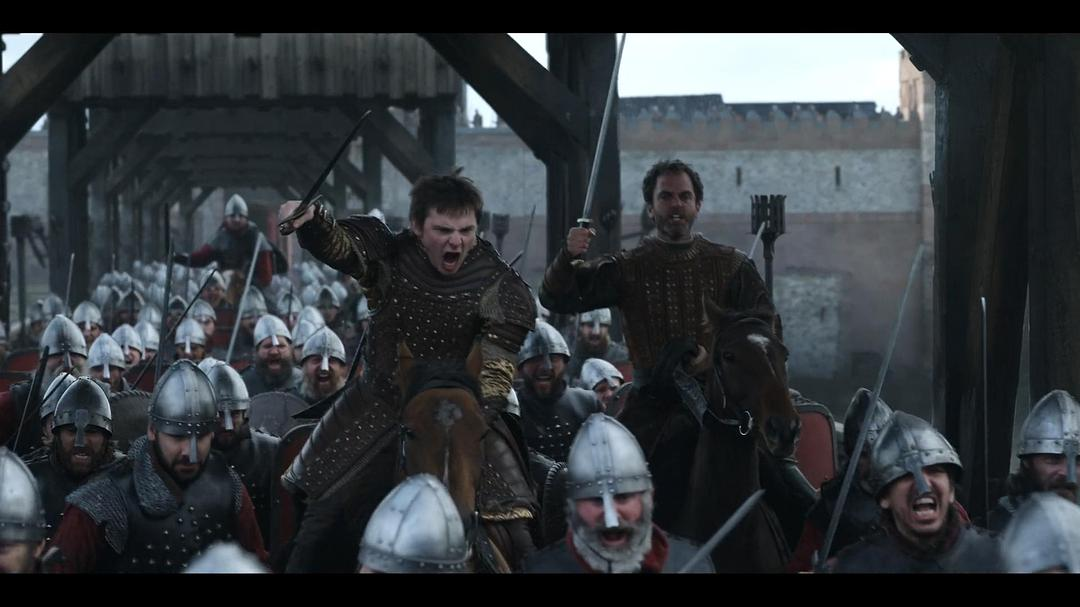 04集:克努特伦敦城下激怒年轻的埃德蒙,傲慢、无脑埃德蒙愤怒出城追击克努特中计,维京人砍断了大桥,埃德蒙被维京人伏兵包围,麦西亚郡长赶来发现艾德蒙被俘后直接撤兵。
