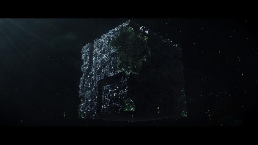 然而瞧他们缩在哪了,本剧第一集末的那个充满压迫感的远景拉伸,让早通过内饰猜出些许的我在看见全景后不由得倒吸口凉气。一大颗废弃的博格方块!