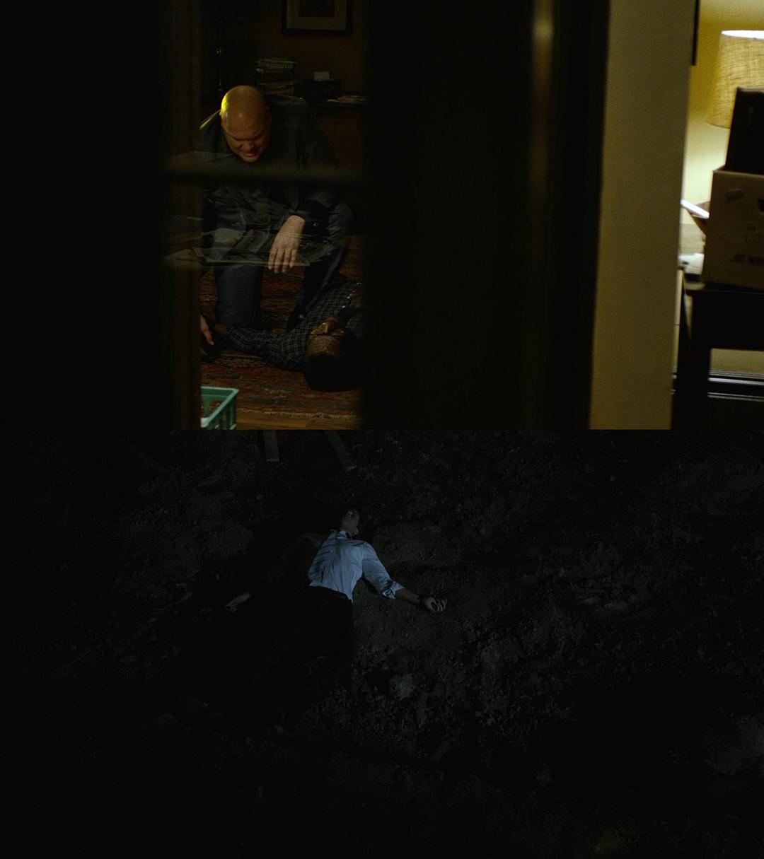 有趣的是,金并的智谋水准却是通过另一位关键反派“靶眼”来进行侧面塑造。由一个角色的脑补推测来讲述另一个角色的背景故事,也同时贡献了本季最具创造性的视觉段落:在金并的顶层公寓内,通过各种资料录音来推理出靶眼的过往。画面褪去色彩,舞台就地搭建,演员无视其他格格不入的视觉要素进行表演,从而勾勒出过往的样貌。