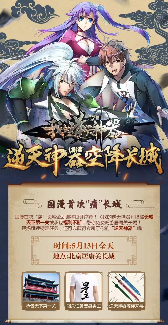 除了带着粉丝们去长城畅玩,彰显民族文化特色的古兵器角色展也会在长城举办,过五关斩六将还能Get逆天福利周边好礼。以上信息划重点,请感兴趣的骚年赶快围观@我的逆天神器 官博去报名!借着国漫首次“痛”长城活动,在宣传作品的同时也传播了中国传统文化,不得不说,这样的宣传方式绝对良心!