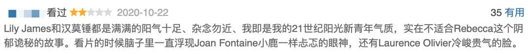 就像这位豆友评论所说:“Lily James和汉莫锤都是满满的阳气十足、杂念勿近、我即是我的21世纪阳光新青年气质,实在不适合Rebecca这个阴郁诡秘的故事。”
