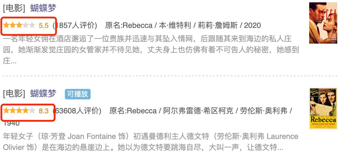 反观新版《蝴蝶梦》,豆瓣开局才5.9分,国外影评平台的分数更是低到令人发指。