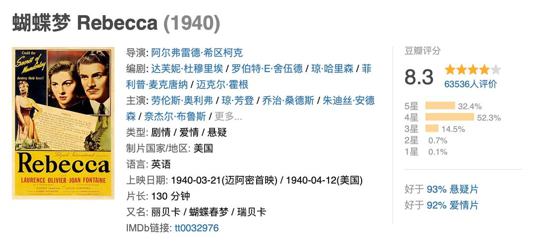 虽然在希导眼里,1940年上映的原版《蝴蝶梦》并不是满意之作,但也阻挡不了它在当年一举拿下奥斯卡最佳影片,并且时至今日依旧能让人惊出冷汗,豆瓣评分也达到了悬疑片难以取得的8.3分。