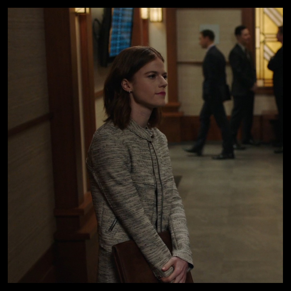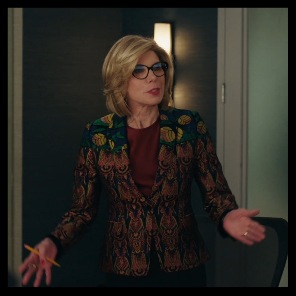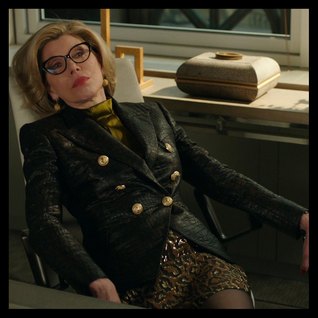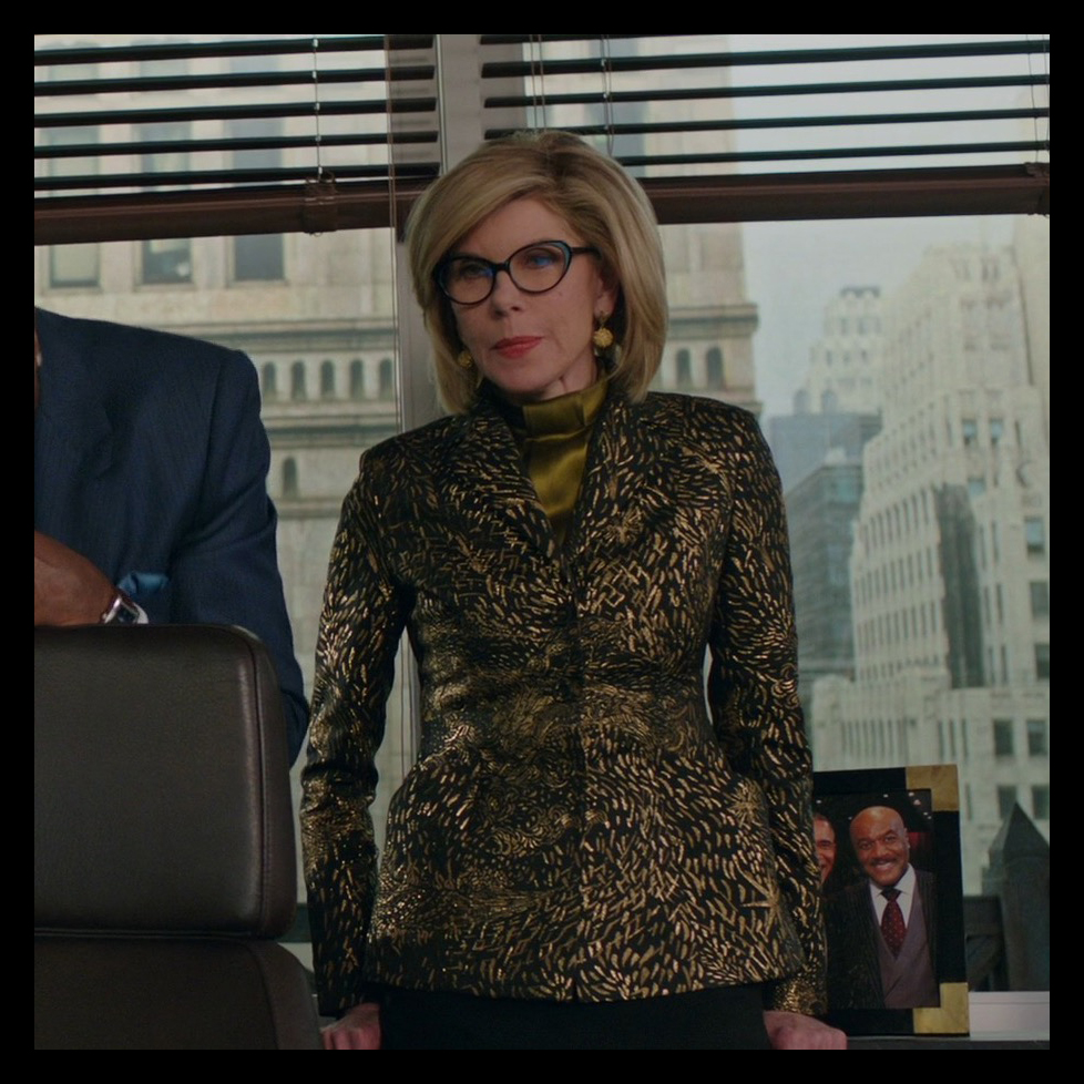 Armani 快成为 Diane 女皇的标配了,同样是金属质感的外套,不似 Liz 那样外套+内搭全套上阵,反而用黑色高领衬衣来减缓金属性带来的侵略感,有气场但不外泄。